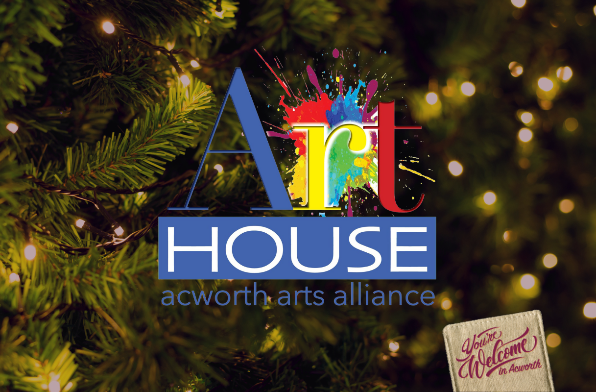 A festive pine tree with string lights features the “Art House acworth arts alliance” logo and a small sign reading “You’re Welcome in Acworth.