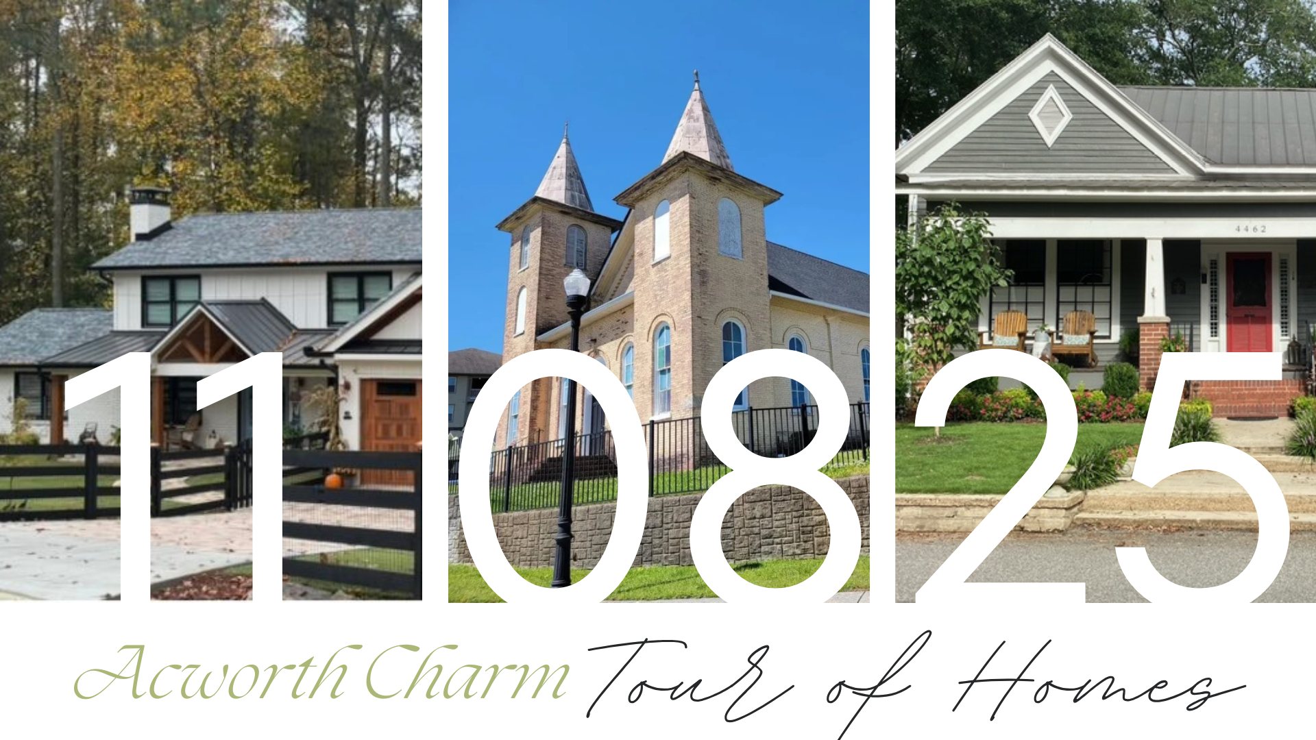 A promotional image for the Acworth Charm Tour of Homes on 11/08/25, showing three different houses and event title text. Haley Hunter2025-10-17T11:41:50-05:00