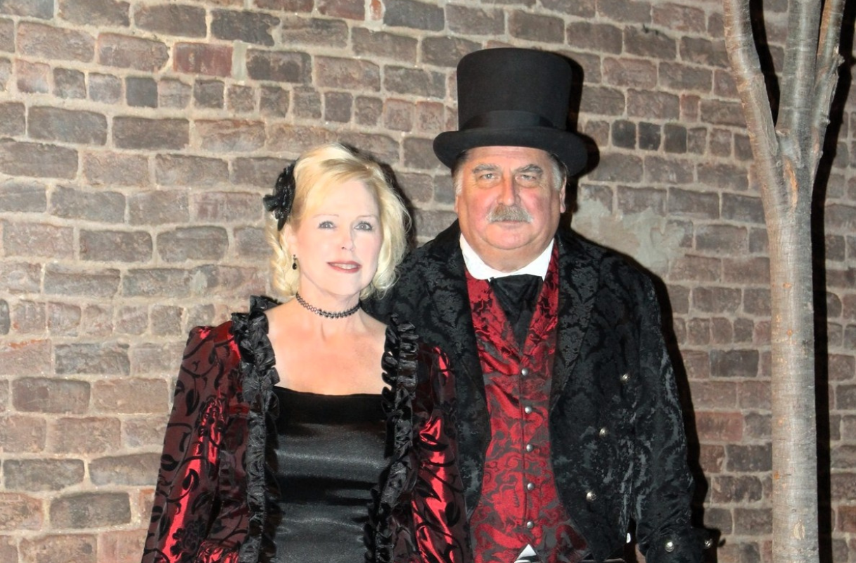 A man and woman in Victorian-style costumes stand in front of a brick wall, with the man wearing a top hat and the woman wearing a black dress with red accents.