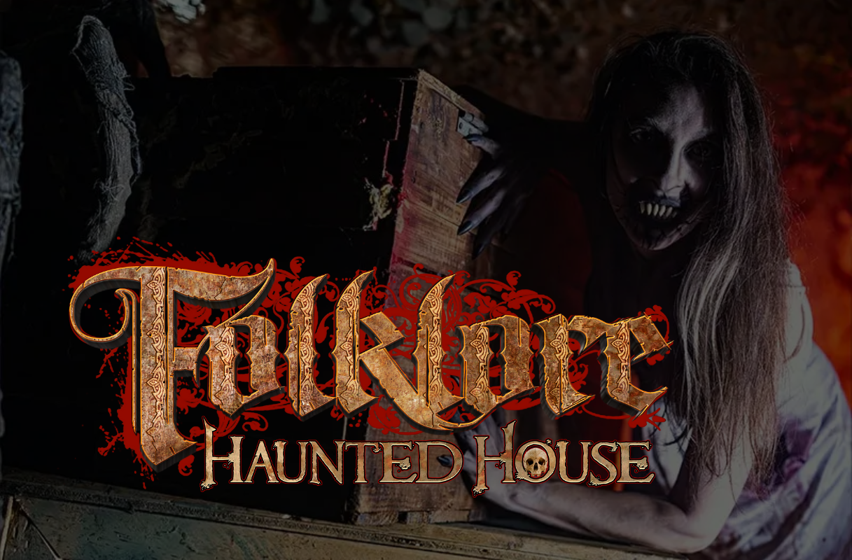 A creepy figure with dark eyes and a wide mouth leans out of a wooden box; text reads “Folklore Haunted House” in ornate, distressed lettering.