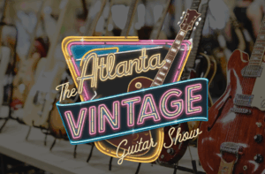 A neon sign reading “The Atlanta Vintage Guitar Show” is superimposed over a display of various vintage guitars on stands. Haley Hunter2025-10-17T11:41:52-05:00