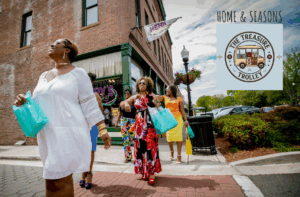 Five women with shopping bags walk out of a brick storefront. A sign reads “The Treasure Trolley.” The weather is clear and sunny.