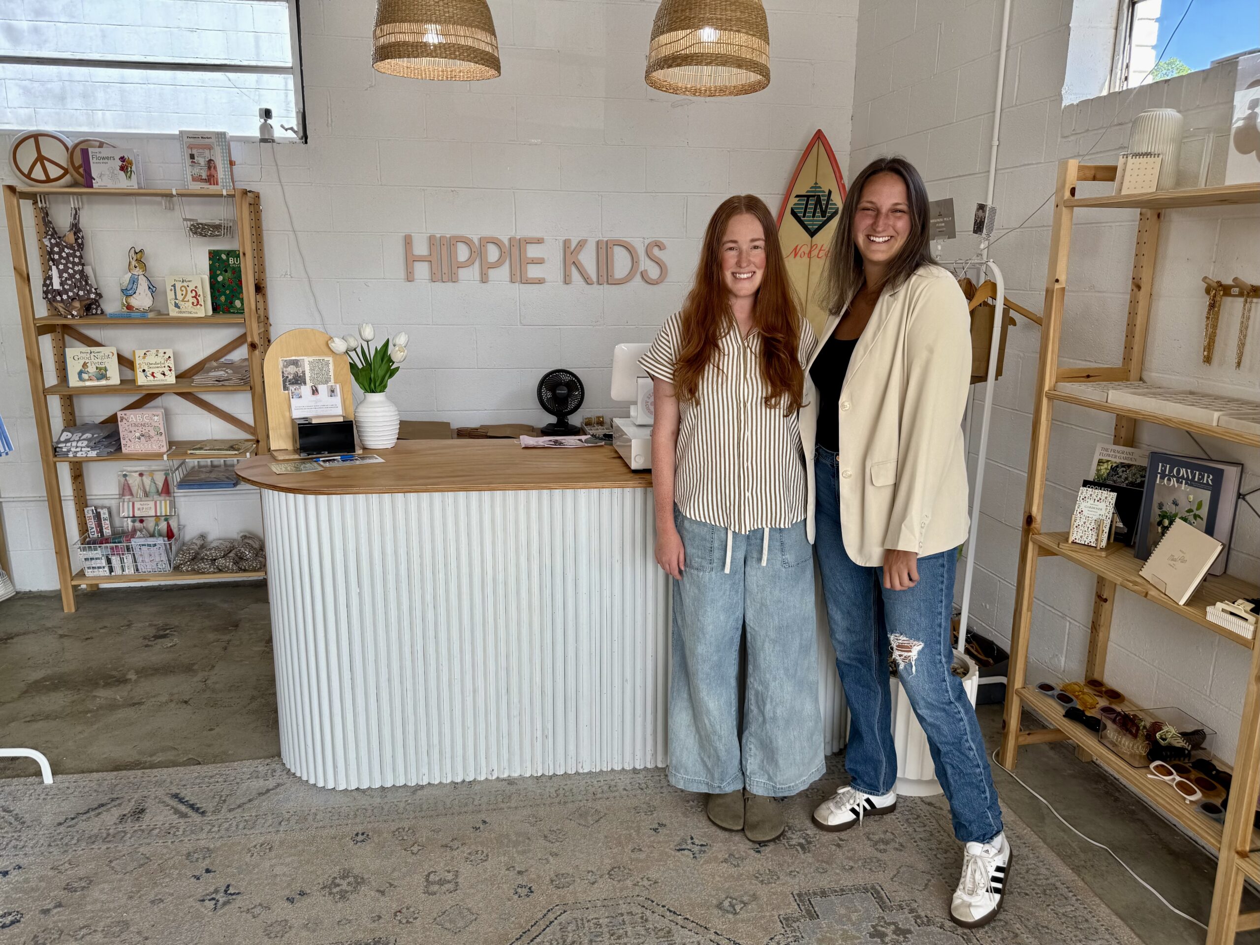 Two women stand and smile in front of a counter inside “Hippie Kids,” a unique store near the great wine market in Downtown Acworth, with shelves displaying various items and decor in the background.