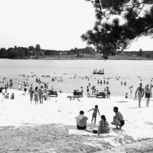 Black and white photo of people relaxing on a sandy beach and swimming in a lake, with trees and benches in the background. Learn more about historic Acworth locations captured in moments like these.