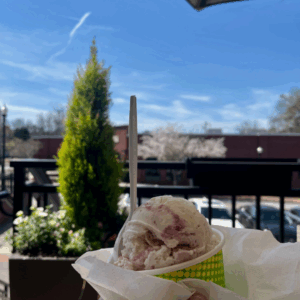 A hand holds a cup of ice cream with a spoon outdoors—perfect for your end of summer bucket list—surrounded by a tree, flowers, parked cars, and a building under the blue sky.