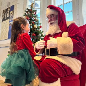 A young girl in a festive dress talks to a person dressed as Santa Claus, seated indoors beside a decorated Christmas tree during the Holly Jolly Happenings for Everyone in Acworth.
