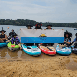 Eight people in witch hats sit on paddleboards at a lakeshore, holding a “Lake Norman Dragons” banner. Trees and water are visible in the background, capturing the festive spirit of Halloween in Acworth.