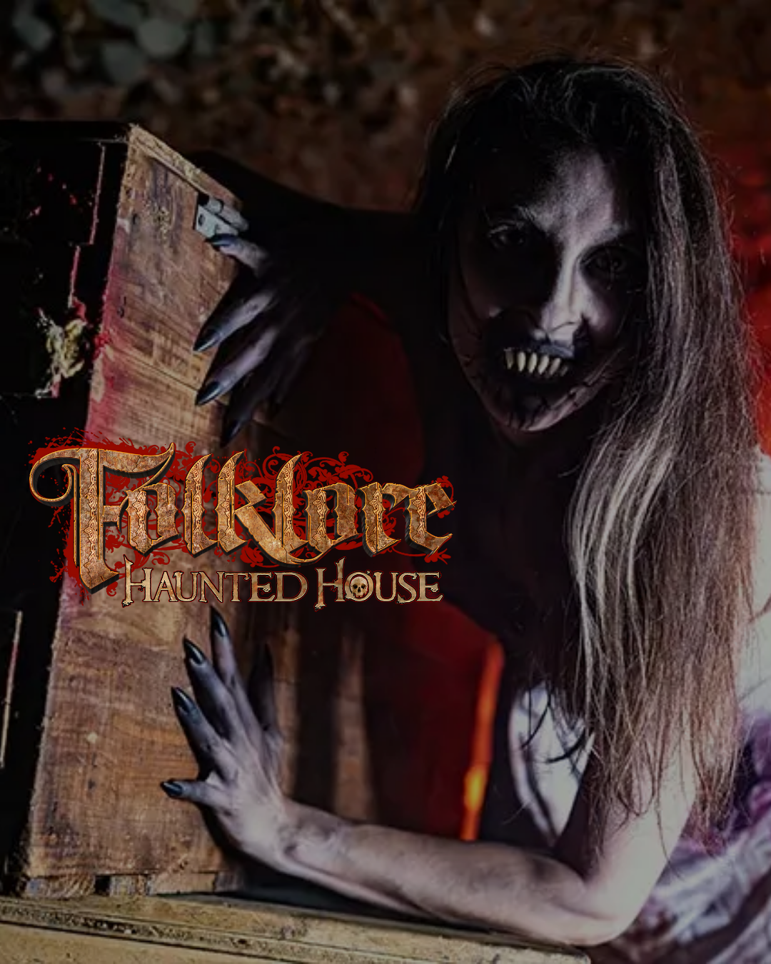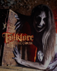 A person in horror makeup with dark, distorted facial features crouches behind a wooden crate. Text reads “Folklore Haunted House”—experience the thrill of HALLOWEEN IN ACWORTH.