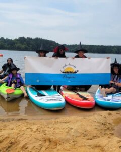 Five people in witch hats sit on paddleboards by a lake, holding a “Lake Norman Dragons” banner on a sandy shore, trees in the background—celebrating Halloween in Acworth with festive spirit and scenic views.