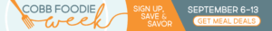 Banner promoting Cobb Foodie Week from September 6–13—sign up, save, and savor! Taste the best of what Cobb County has to offer with a Cobb Foodie Week Meal Deals Pass and enjoy exclusive offers.