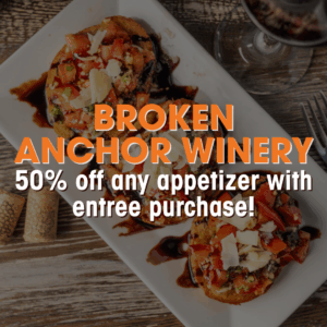 A rectangular plate of bruschetta sits on a table next to a wine glass and corks. Taste the best of what Cobb County has to offer with a Cobb Foodie Week Meal Deals Pass—enjoy 50% off appetizers at Broken Anchor Winery with any entrée purchase.