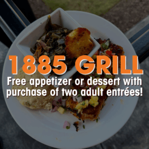 A plate of food with vegetables, cornbread, and a main dish; overlaid text offers a free appetizer or dessert with two adult entrée purchases at 1885 Grill. Taste the best of what Cobb County has to offer with a Cobb Foodie Week Meal Deals Pass!.